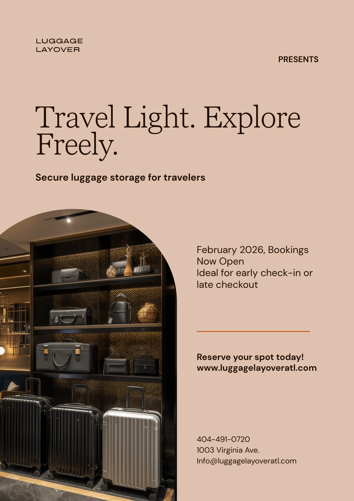 luggage concierge and secure storage service strategically located in Atlanta, Georgia-just one mile from Hartsfield-Jackson Atlanta International Airport and directly across the street from the Hapeville Police Department. Our mission is to provide travelers with a safe, convenient, and stress-free solution for storing and managing their luggage during layovers, early check-outs, late departures, business travel, and city exploration.